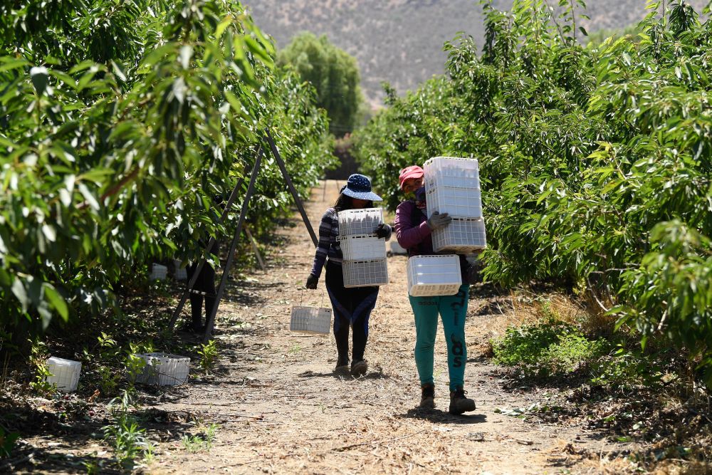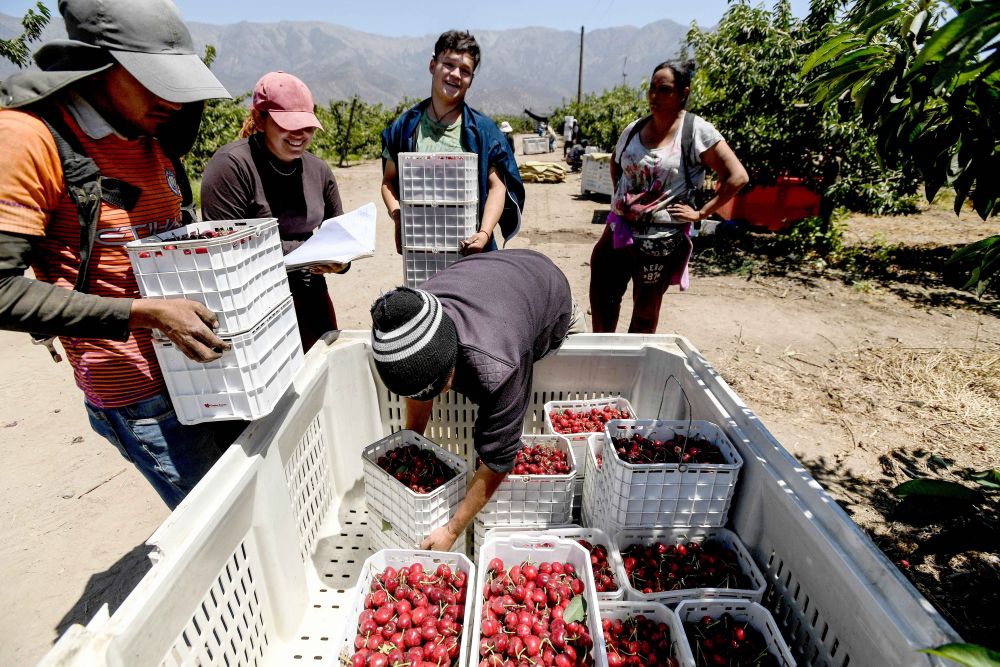 ↑工人在智利首都圣地亞哥附近采摘車厘子
