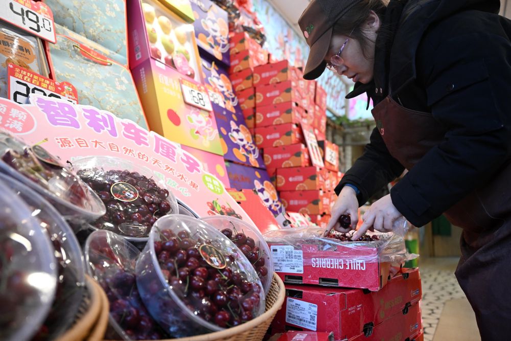 ↑在天津市南開區一家水果店內,店員挑選車厘子準備打包