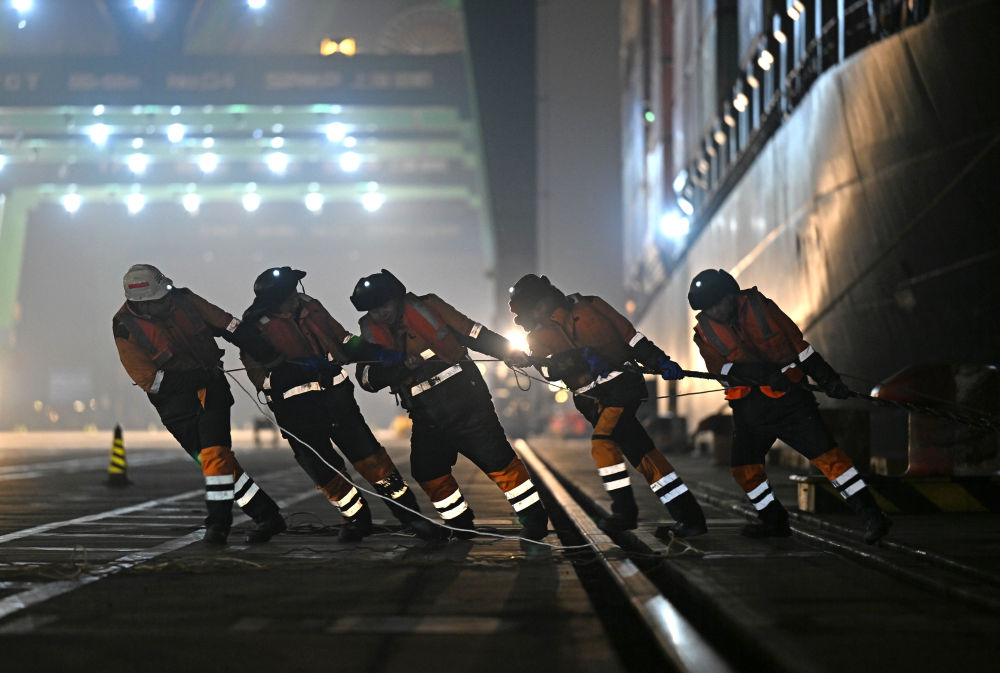 ↑工作人員在為剛靠泊碼頭的“巴赫”號集裝箱班輪固定纜繩