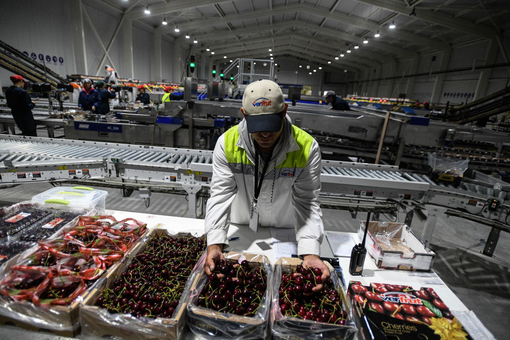 ↑在智利奧希金斯大區拉斯卡夫拉斯一家水果包裝廠內,工作人員檢查已經裝箱的車厘子