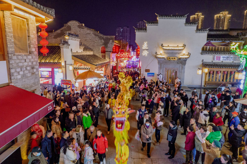 舞龍巡游在安徽蕪湖古城花街上演(2024年2月10日攝)。新華社發