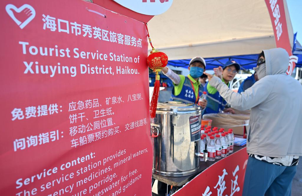 記者在新海港附近一處旅客服務點看到,幾位志愿者在向旅客發放免費礦泉水和餅干。