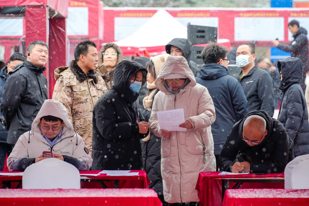 2月19日,求職者在陜西省渭南市2024年“春風行動”暨勞務協作現場招聘會了解企業招聘情況。新華社發(崔正博攝)