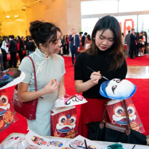 1月28日,在位于美國華盛頓的中國駐美國大使館,青年學生在中美青年新春聯歡活動上體驗畫臉譜。新華社記者劉杰攝