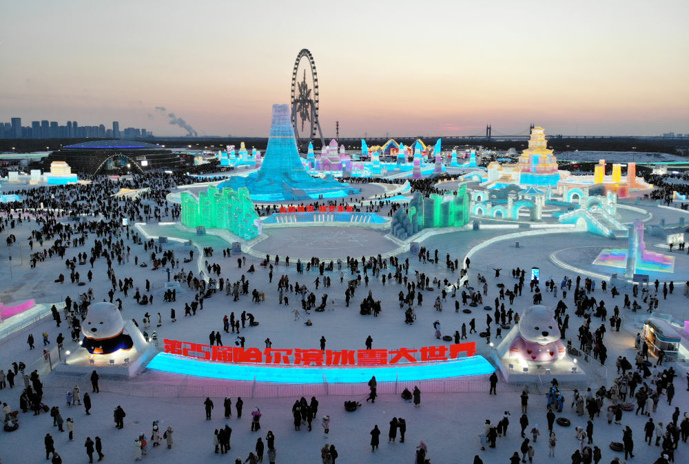 2024年2月15日,游客在哈爾濱冰雪大世界園區內游玩(無人機照片)。新華社記者 王建威 攝