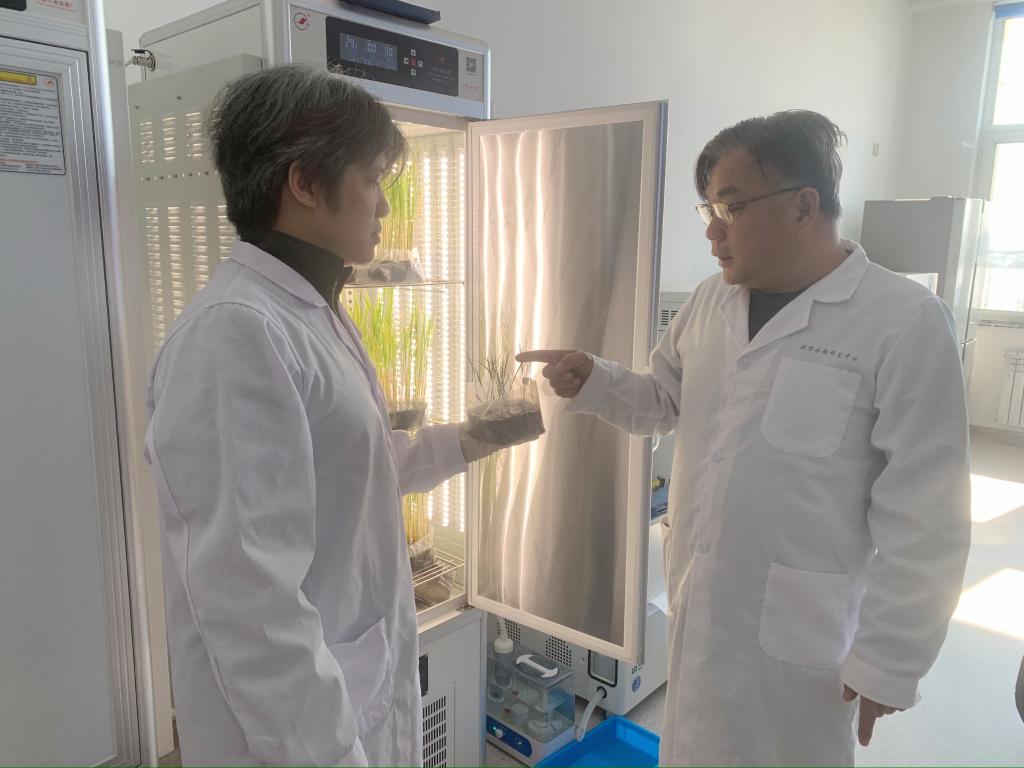 北方水稻研究中心主任曹立勇(右一)和同事正在查看水稻秧苗生長情況。(受訪者供圖)