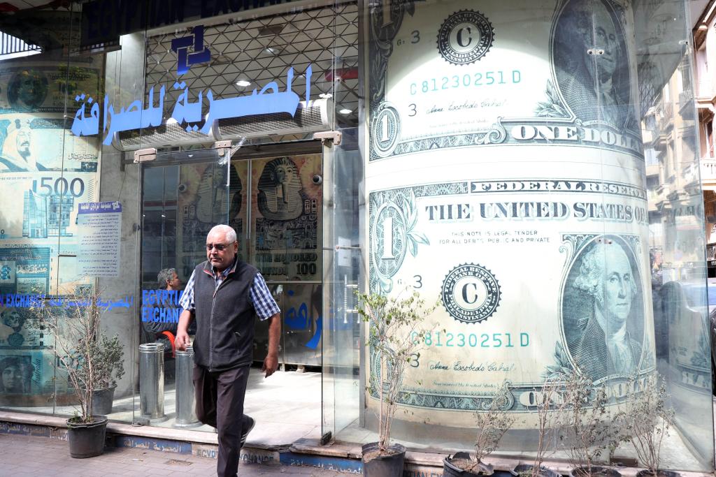 3月6日,一名男子走出埃及開羅的一家貨幣兌換點。新華社發(艾哈邁德·戈馬攝)