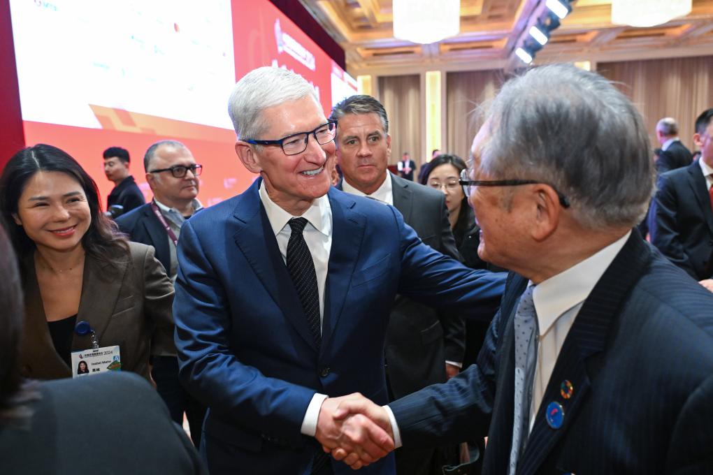 3月24日,蘋果公司首席執行官蒂姆·庫克(中)在中國發展高層論壇2024年年會會場與嘉賓交流。新華社記者 李鑫 攝