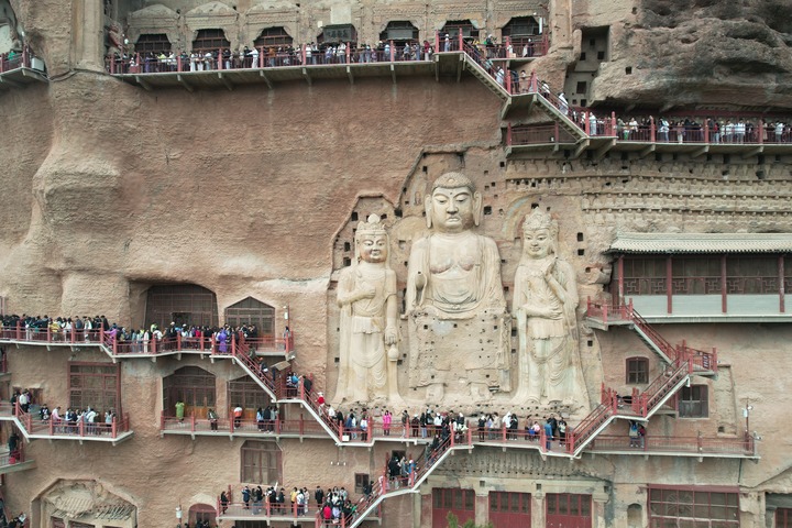 4月5日,游客在位于天水市麥積區的麥積山石窟游覽(無人機照片)。 新華社記者 張智敏 攝