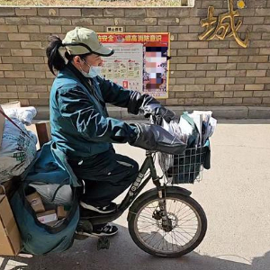3月29日,杭州菜鳥速遞快遞員姜榮成在確認消費者送貨上門要求后,正在上門配送。(受訪者供圖)