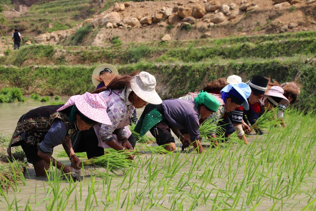 歌聲在梯田間飄蕩,村民們懷著歡快的心情拔秧、插秧……一排排蔥綠的秧苗整齊地排列于田間,微風吹過,秧苗輕輕搖擺,蕩漾起無限生機。