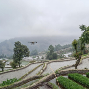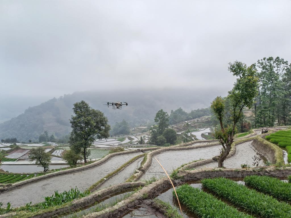 4月9日,元陽縣牛角寨鎮良心寨村運用無人機進行播種。(葉秉鳳 攝)