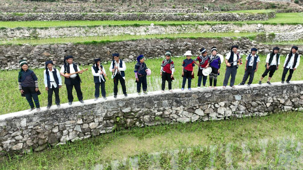 在元陽縣沙拉托鄉的哈尼梯田緩沖區,當地舉行“開秧門”活動,村民們在田間地頭祈福,他們載歌載舞,迎接春耕的到來。哈尼族多聲部民歌州級傳承人羅們妹說:“這是我們老一輩傳承下來的民俗,一邊栽秧一邊唱歌,一邊跳樂作舞,意味著稻谷會飽滿、豐收?!?/p>