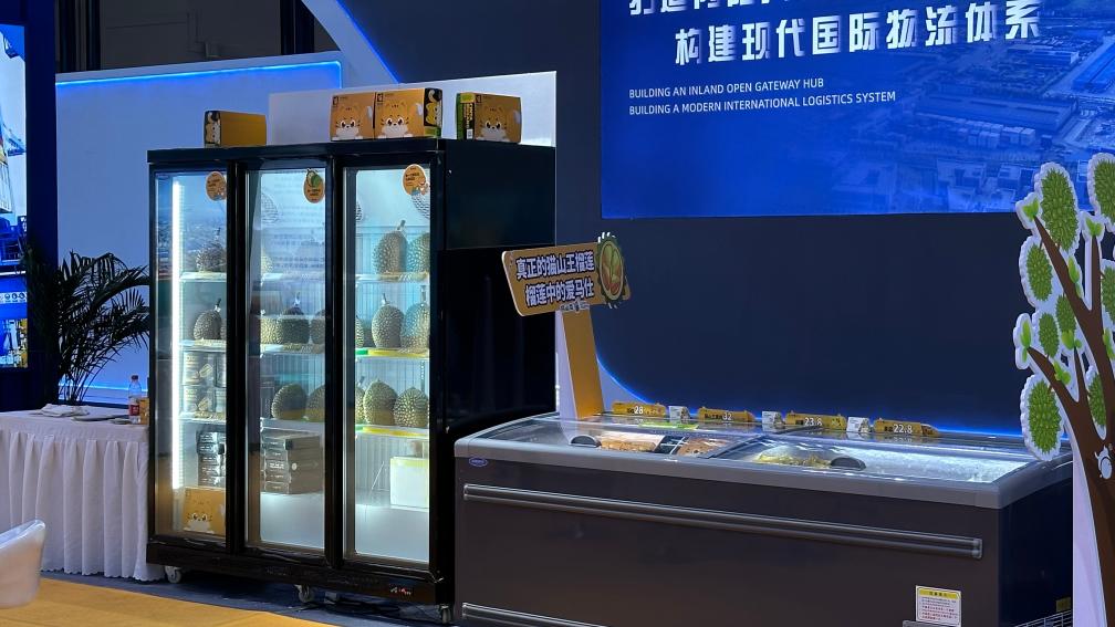 走進展館,北部港灣集團展區人頭攢動,冰柜里展示售賣的馬來西亞新鮮榴蓮讓人一時忘記自己身處重慶。