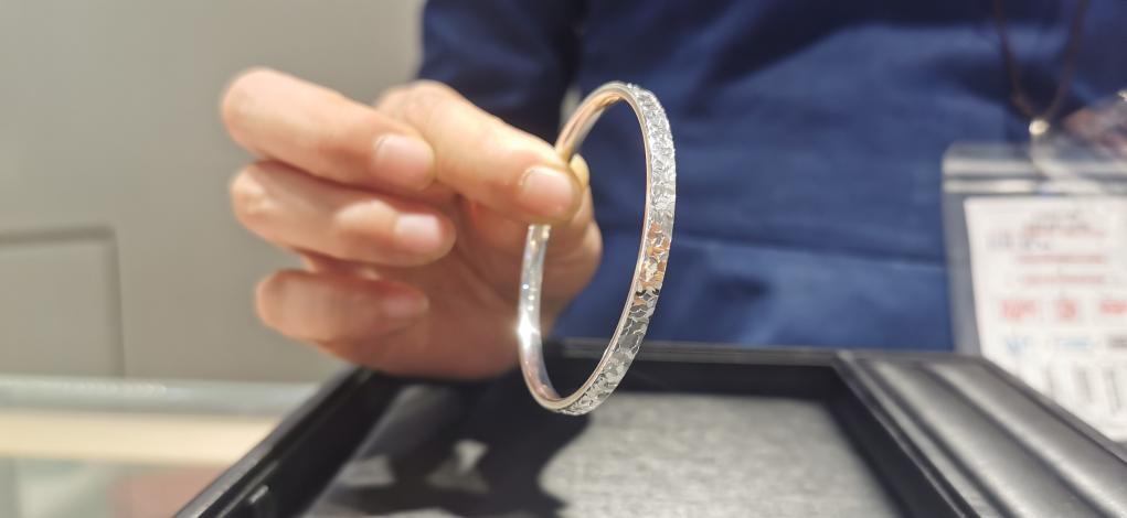 6月6日,在北京一家商場金店內,店員展示到貨的銀手鐲。新華社記者任軍 攝