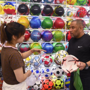 歐錦賽和即將到來的巴黎奧運會帶動了體育消費熱潮,世界各地的采購商抓住商機,提前來到義烏采購各式各樣的體育產品。主營足球產品的吳曉明同樣在忙著給客戶發貨?!艾F在我的倉庫里有一個柜子的貨要發往法國,還有一個西班牙的客戶已經返單,預計近期發貨?!眳菚悦髡f。
