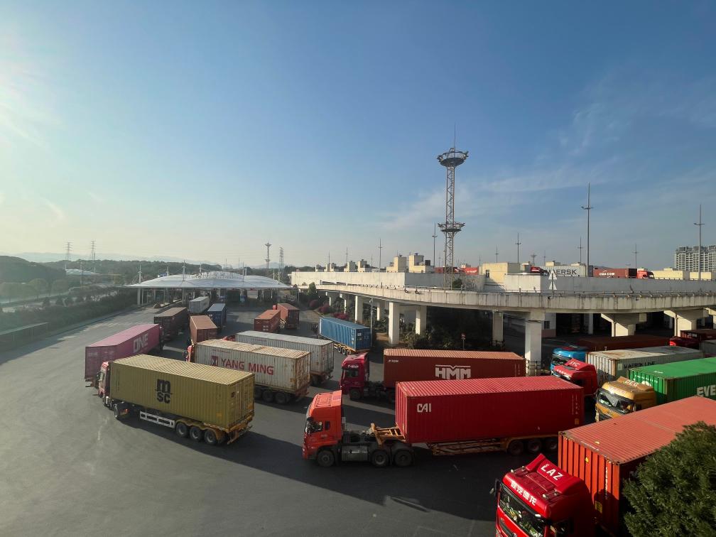 圖為義烏港海關監管場所內等待駛往寧波舟山港出海的集裝箱卡車。受訪者供圖