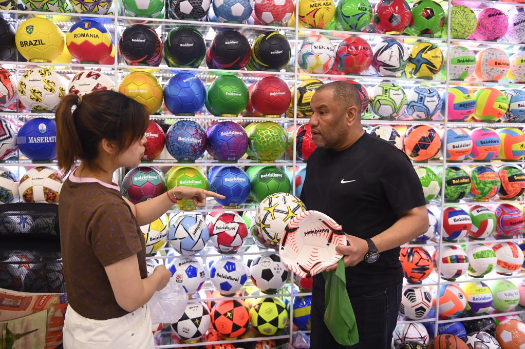 5月30日,義烏國際商貿城的商戶(左)向埃及客商介紹足球產品。新華社記者 黃宗治 攝