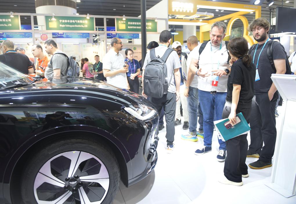4月15日,采購商在第135屆廣交會上了解新能源汽車。新華社記者盧漢欣攝