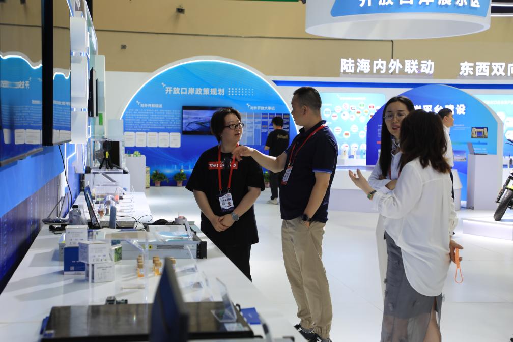 7月6日,在第三十屆蘭洽會主展館,展商向參會人員推介商品。新華社記者張智敏 攝