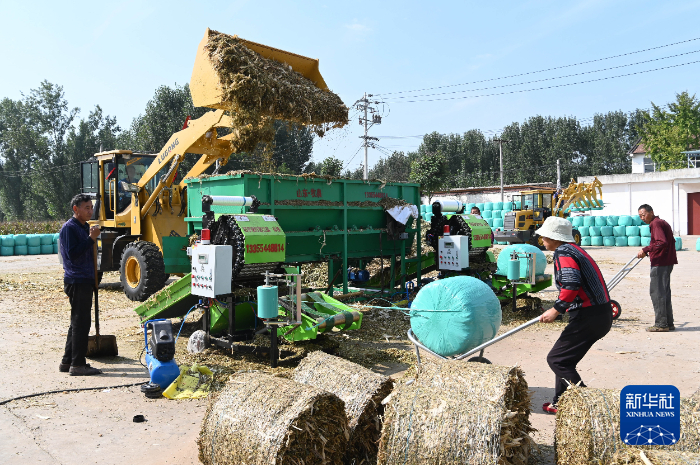 在河南省沁陽市柏香鎮南王村,一家種植專業合作社社員打包加工青貯飼料。新華社發(楊帆 攝)