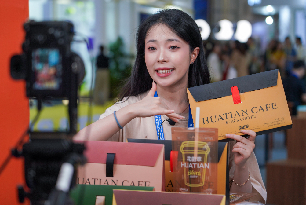 2024年7月26日,參展商在南博會咖啡產業館直播帶貨。新華社記者 王靜頤 攝