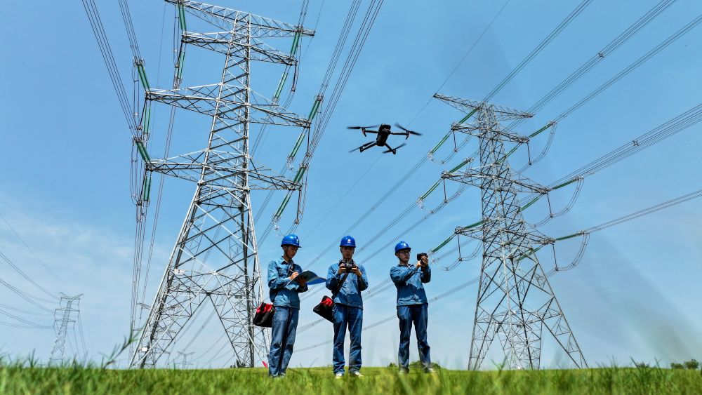 面對安徽、江蘇持續高溫,皖蘇兩省的電力工人聯合對省際聯絡線及相關配電設施進行檢修,并開展輸變電設施巡視檢查。這是在安徽省滁州市南譙區,電力工人運用無人機對500千伏輸電線路進行巡視檢查(2024年8月9日攝)。新華社記者 曹力 攝