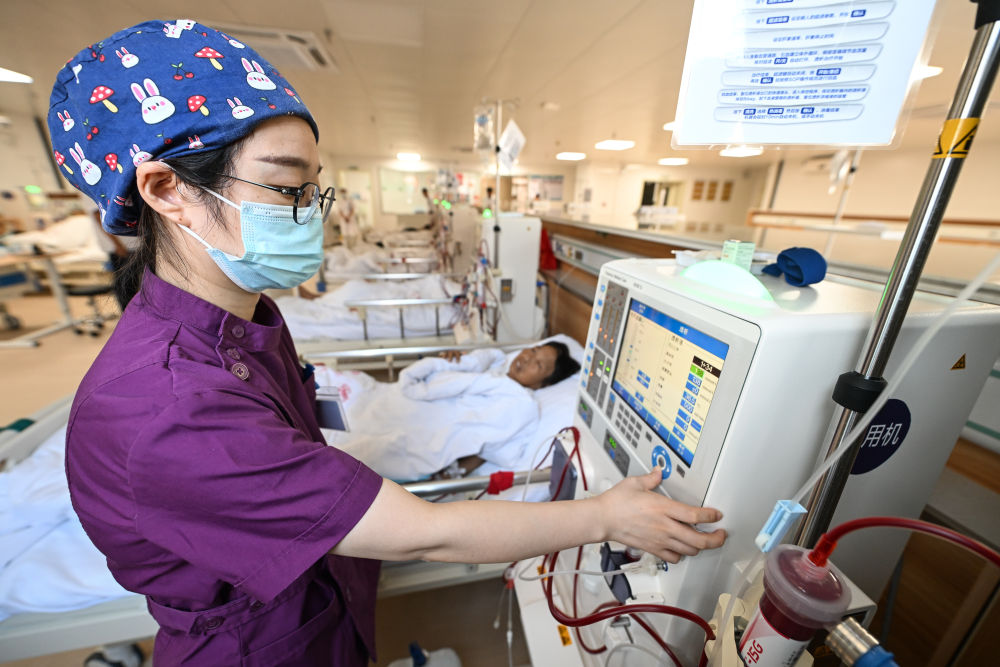 江蘇海安市曲塘中心衛生院護士在血液透析中心操作設備(2024年7月31日攝)。海安加快優質醫療資源下沉,對基層醫療機構管理、技術等方面進行幫扶。數據顯示,2023年海安市縣域內就診率為90.54%,基層醫療衛生機構門急診占比為74.86%。新華社記者 季春鵬 攝