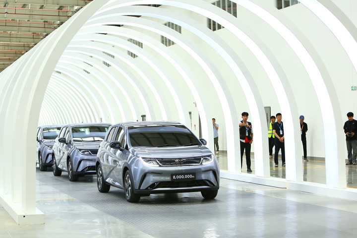 7月4日,在位于泰國羅勇府的比亞迪泰國工廠,比亞迪第800萬輛新能源汽車在儀式上亮相。 新華社記者 孫瑋彤 攝