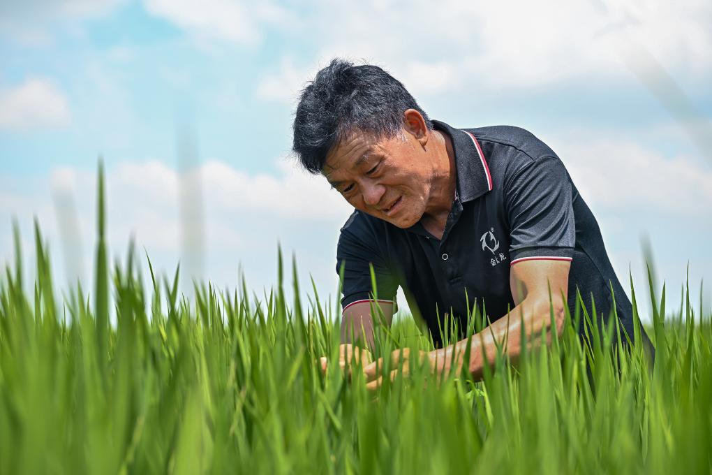 安徽鳳陽小崗村種糧大戶程夕兵在田里觀察水稻長勢(2024年7月25日攝)。新華社記者 李鑫 攝