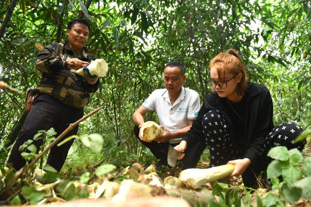 顏茜茜(右)和父親顏建條(中)在竹筍種植基地采收竹筍(2024年7月23日攝)。29歲的顏茜茜是廣西柳州市柳江區三都鎮白見村的一名返鄉創業青年。2021年,大學畢業后在機場工作了五年的她,決定辭職回到家鄉創業。新華社記者 黃孝邦 攝