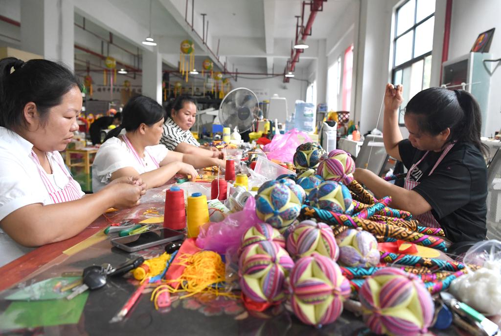 工人在廣西靖西市繡蘊坊繡球文化有限公司制作繡球燈(2023年8月2日攝)。靖西市新靖鎮舊州村基本每家每戶都有人會制作繡球,年產繡球約50萬個。對于當地人來說,繡球不僅代表古老的手工藝,更是增收致富的手段,讓農村婦女能夠就近就業和居家靈活就業。新華社記者 周華 攝