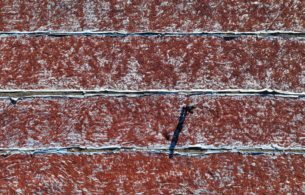 河北省遵化市侯家寨鎮的農民在晾曬用于中藥材的山楂片(2023年11月14日攝,無人機照片)。近年來,河北省遵化市在推進山地生態修復和產業富民過程中,引導農民在荒山坡上種植山楂樹,為種植戶帶來良好收益的同時,實現荒山披綠。新華社記者 楊世堯 攝