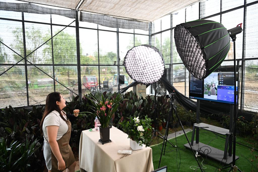 帶貨主播在江蘇省宿遷市宿豫區陸集街道一處綠植銷售基地推介銷售綠植(2024年6月11日攝)。新華社記者 季春鵬 攝