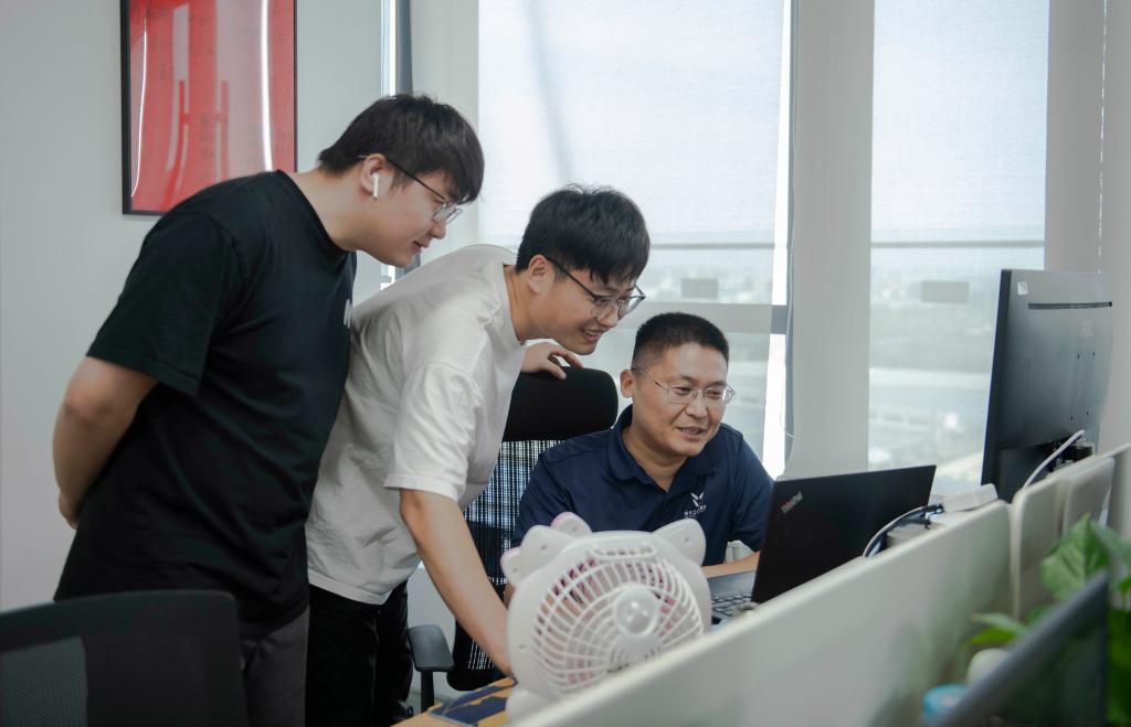 8月9日,在位于安徽省合肥市的羚羊工業互聯網股份有限公司,工業互聯網運維員朱有康(右一)在工位與團隊成員討論工作。新華社記者 傅天 攝