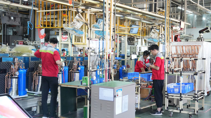 在位于廣州市南沙區的廣東芬尼科技股份有限公司生產基地內,生產部的員工在生產線上對機組進行組裝安檢等工作(2024年5月10日攝)。新華社發(黃長亮 攝)