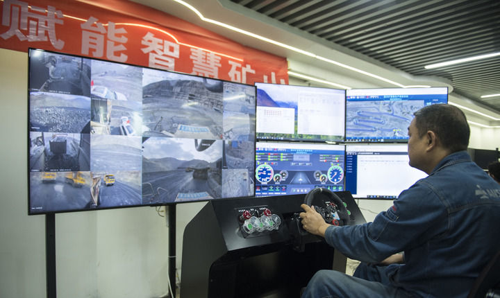 2024年4月11日,技術人員在位于四川省攀枝花市的攀鋼礦業朱蘭鐵礦智慧管控中心遠程操控無人自動駕駛礦車。新華社記者 張豪夫 攝