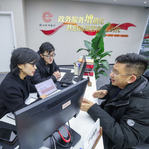 2024年2月29日,在浙江省嘉興市南湖區企業綜合服務中心內,產業板塊首席服務專員在接待辦事企業人員(右)。新華社記者 徐昱 攝