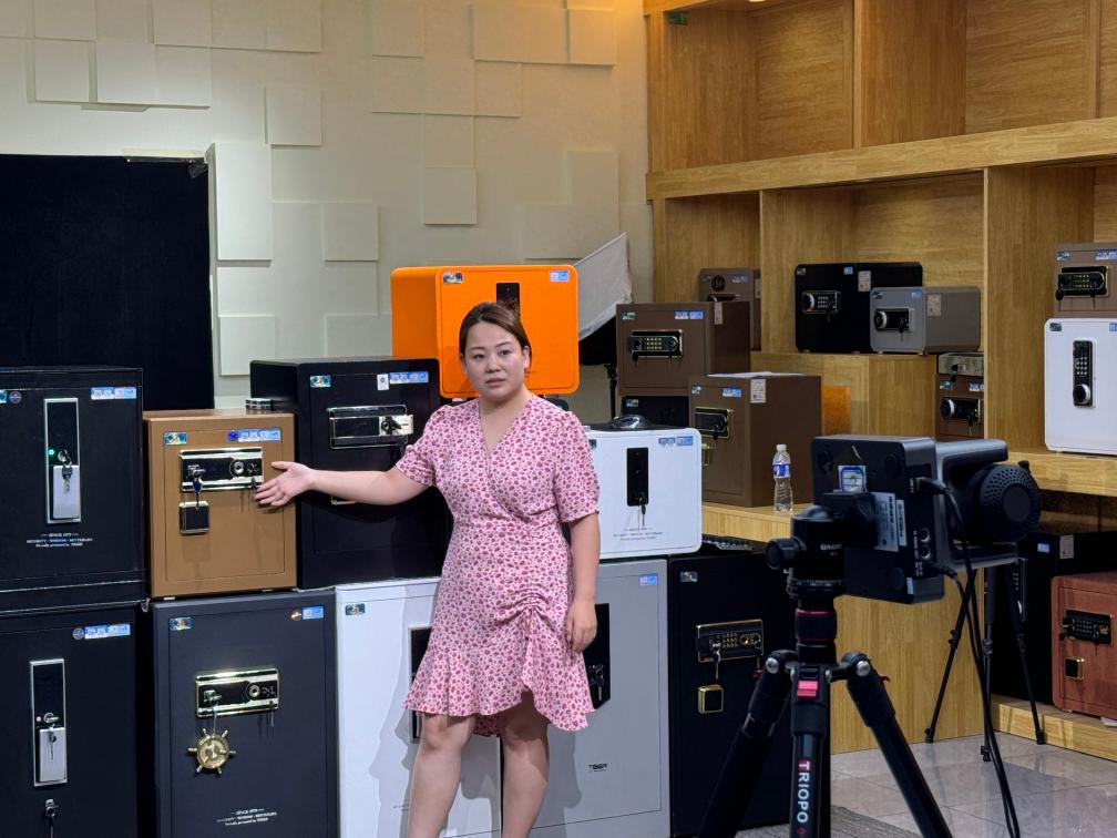 新華社石家莊8月24日電(記者王昆)在河北省衡水市武邑縣電商大廈內,河北鼎澤金屬制品有限公司的網絡主播趙彩梅通過直播平臺與國內外網民互動,讓他們全面了解密碼識別、指紋識別、瞳孔識別等不同類型的保險柜,并解答保險柜安全質量、使用方法等方面的困惑。