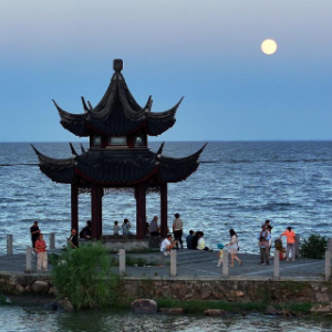 9月17日,人們在江蘇省宜興市丁蜀鎮太湖邊賞月(無人機照片)。 新華社發(丁煥新攝)