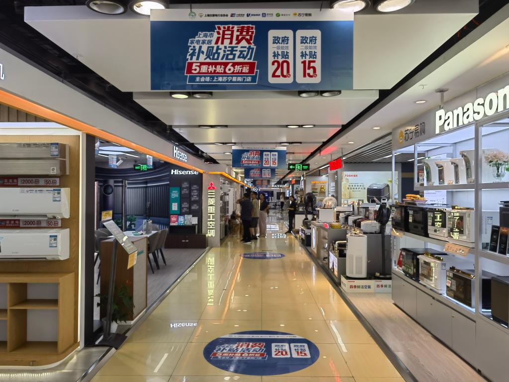 在上海市長寧區的一家蘇寧易購門店內,隨處可見“以舊換新”補貼活動標語。新華社記者周心怡 攝