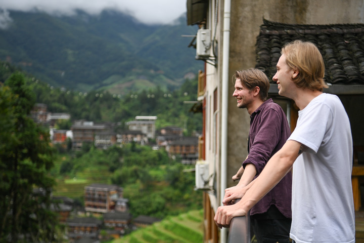 來自德國的游客在桂北山區大寨村的一家民宿賞景(2024年6月26日攝)。新華社記者 鄒競一 攝