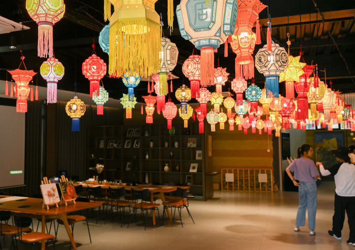 在浙江臺州仙居縣白塔鎮上葉村的仙居巖畫藝術中心,當地非遺項目仙居針刺無骨花燈工藝品掛在展示廳(2024年7月28日攝)。新華社記者 李賀 攝