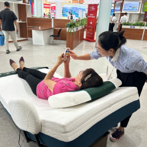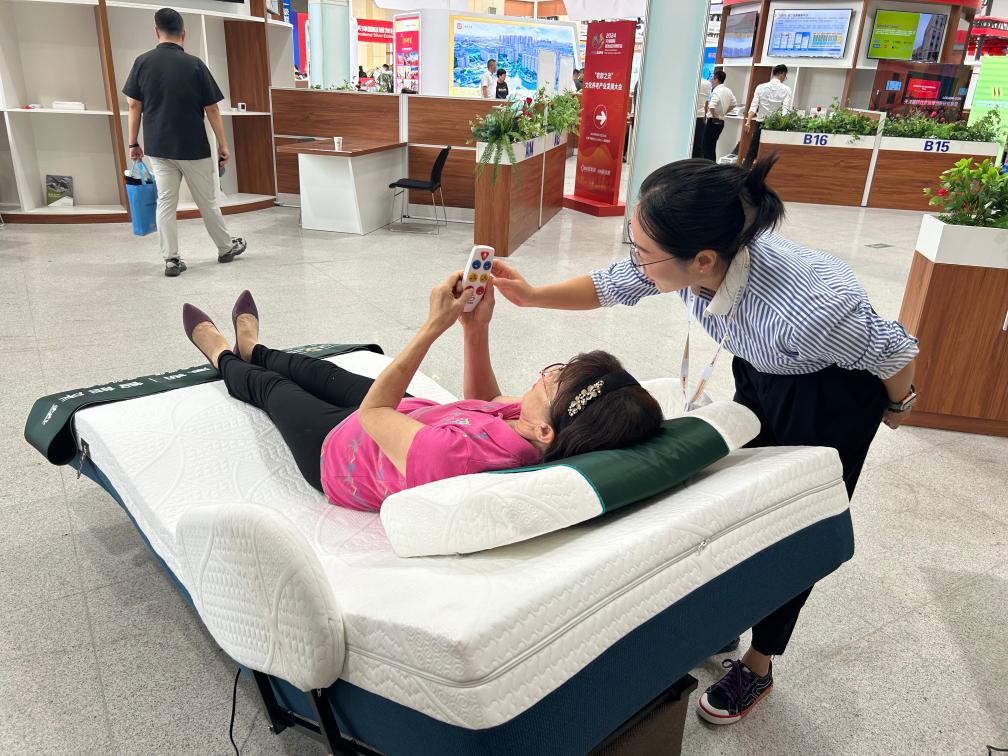 在2024天津國際銀發經濟博覽會上,觀眾在體驗適老功能床墊。新華社記者 尹思源 攝