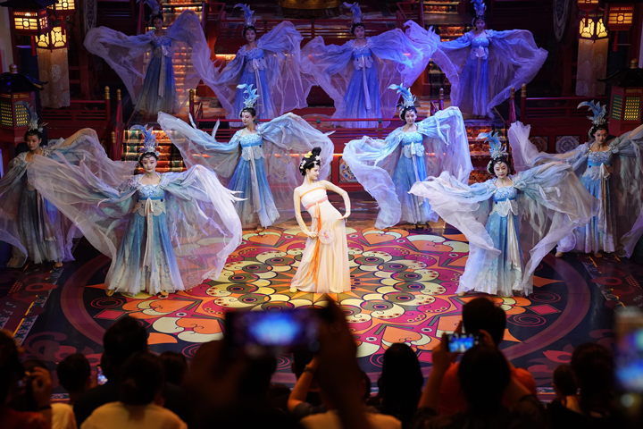 5月19日,游客在西安長安十二時辰景區觀看表演《霓裳羽衣舞》。新華社記者邵瑞 攝