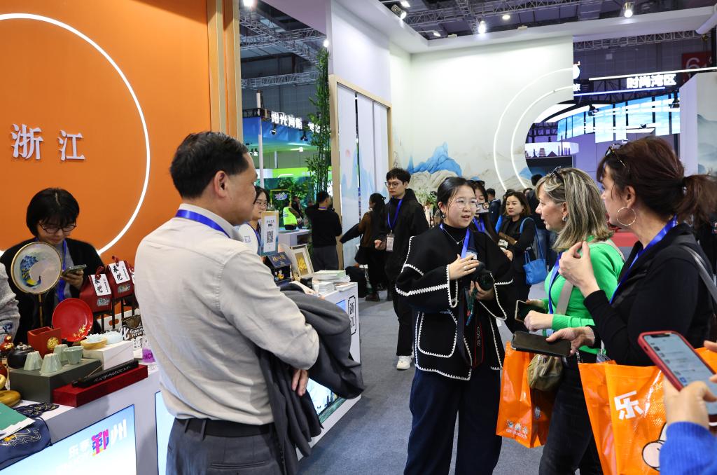 幾位參觀者在浙江省展臺前交流討論。新華社記者 方喆 攝