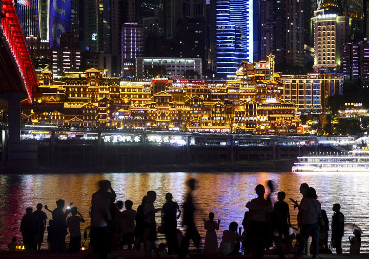 游客在重慶市江北區嘉陵江畔觀賞洪崖洞景區的夜景(2024年8月23日攝)。新華社記者 劉潺 攝