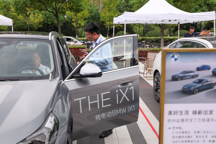 在浙江省杭州市上城區丁蘭街道,經銷商(右)在“美好生活 煥新出發”消費品以舊換新展會現場向消費者介紹車輛(2024年9月27日攝)。新華社記者 江漢 攝