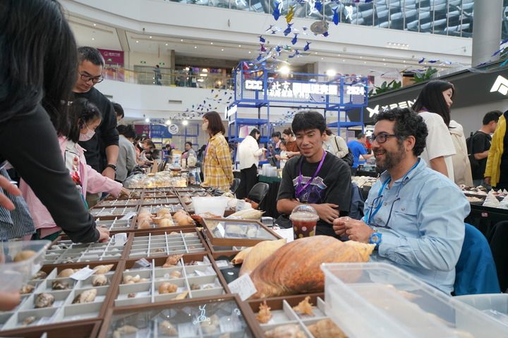 在北京市朝陽區一家商場舉行的貝殼展上,攤主與顧客交流(2024年10月2日攝)。新華社記者 吳青昊 攝