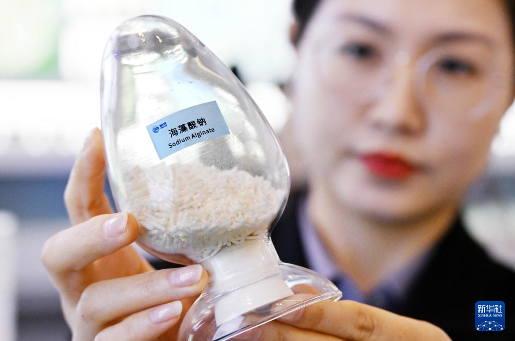 工作人員在展示晶狀海藻酸鈉(11月14日攝)。新華社記者 李紫恒 攝